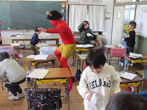 今日は、節分。御宿小の1年生教室に鬼が来ました。1年生は大騒ぎ。はじめは怖がって「おにはーそとー!」を言うのも忘れていましたが、先生に言われて、元気な「おにはーそとー!」の声がでました。豆をまいて、無事に鬼を追い出しました。