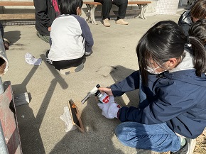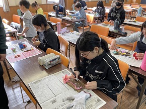 はじめに、「焼き板」づくりを体験しました。ガスバーナーやポスカ、造花などを使って、オリジナルの焼き板を作りました。おうちで飾れますね!
