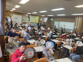 おいしいお弁当の後は、千葉県の伝統工芸品である房州うちわづくりを体験しました。材料は房州産の女竹(めだけ)で、竹の丸みを生かした「丸柄」や、格子模様の美しい「窓(まど)」が特徴です。思い思いの和紙を貼り付けて、素敵なうちわが完成しました。