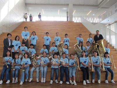 郡市音楽発表会が、勝浦のキュステを会場に行われました。今回は全部で11校の参加があり、御宿小金管部は9番目に登場して「オーラ・リー」を披露しました。これまでの練習の成果を発揮し、きれいな歌声・楽器の音色をホールに響かせることができました。本番が終わって、ホッとした表情の1枚です。
