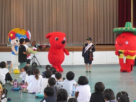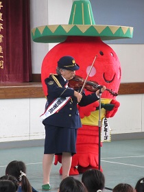 いすみ警察署の一日署長、世界的ヴァイオリニストの黒沼ユリ子氏が本校を訪問し、バイオリンの演奏をお聞かせくださいました。黒沼氏からは、「命を大切に!」というお話がありました。暑い中、エビアミーゴ、いすみん、そしてチーバくんも来てくれて、子供たちは大喜びでした。