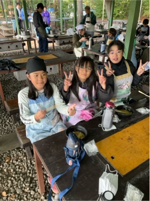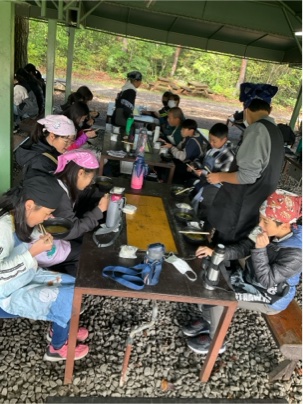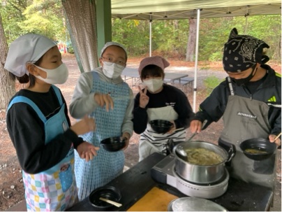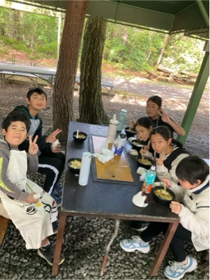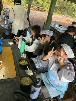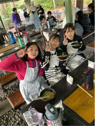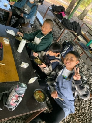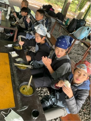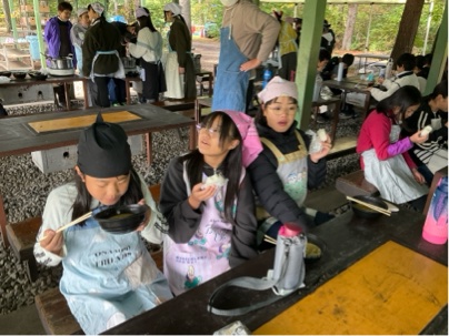 出来上がったほうとうを食べています。皆さん、上手にできましたね。