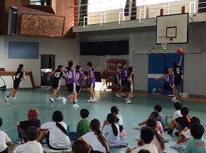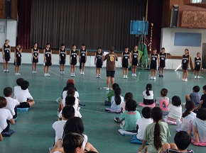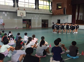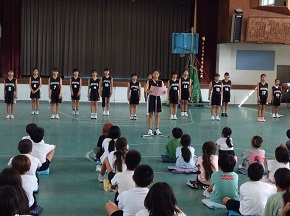 あさって開催の1地区ミニバス大会に向け、壮行会を行いました。デモンストレーションとして披露されたミニゲームでは、随所にナイスプレーが見られ、そのたびに大きな拍手が起こりました。本番でも、みんなで声を掛け合い、一致団結して頑張ってほしいです。 頑張れ!御宿小!