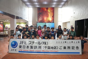 続いて、JFEスチール株式会社東日本製鉄所(千葉地区)に行きました。はじめに鉄の使い道や作り方などについて映像で学び、それからいよいよ製鉄所の敷地内へ。東京ドーム164個分というとても広い敷地に、原料である鉄鉱石や石炭、石灰石の大きな山があったり、まるでハウルの動く城のような溶鉱炉があったり…。ほかにもたくさんの工場があって、圧倒されました。連続鋳造(ドロドロの鋼を冷やして厚い板にする)工場を見学し、ものすごい熱さも感じてきました。